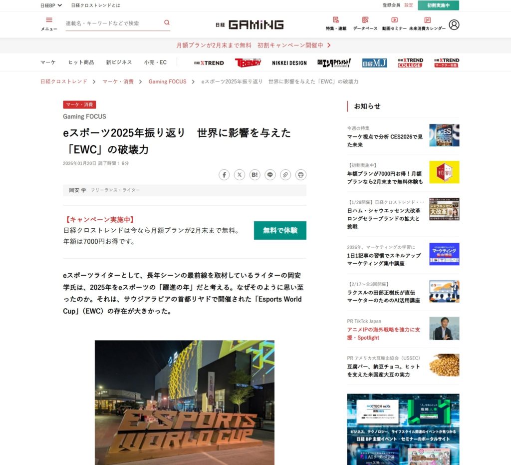 eスポーツ2025年振り返り 世界に影響を与えた「EWC」の破壊力が、日経Gamingに掲載されました。