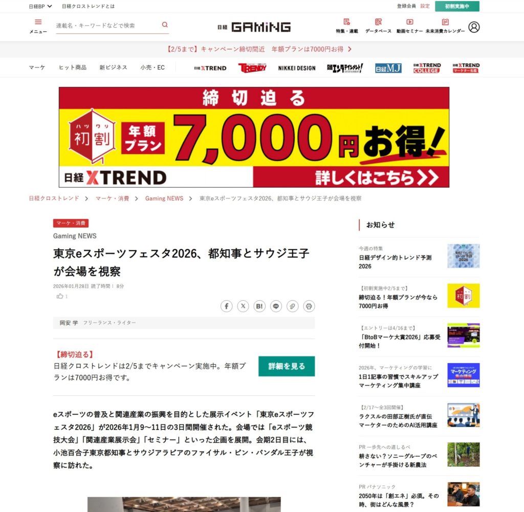 東京eスポーツフェスタ2026、都知事とサウジ王子が会場を視察が、日経Gamingに掲載されました。