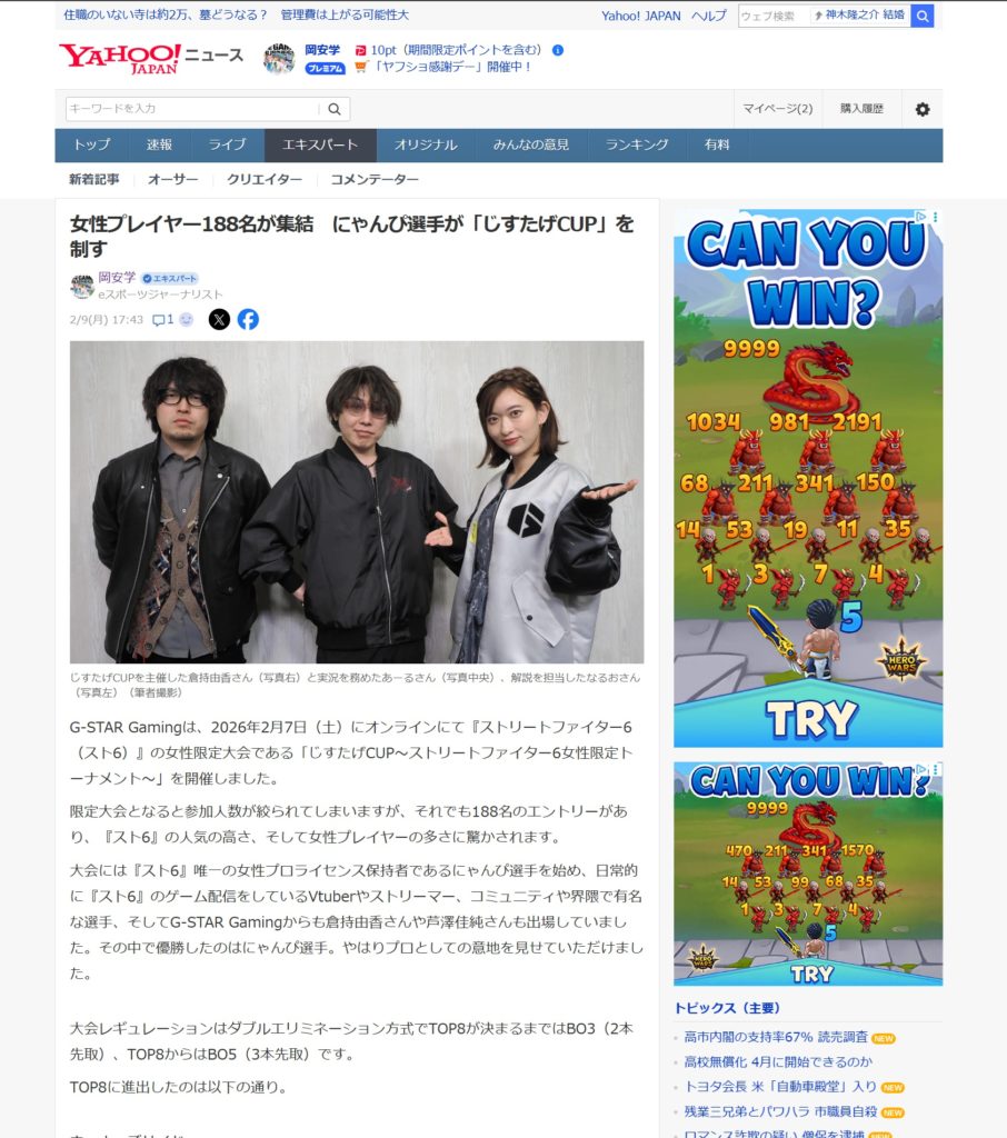 群馬県で19歳以下のeスポーツ大会が開催が、Yahoo!JAPANニュースに掲載されました。