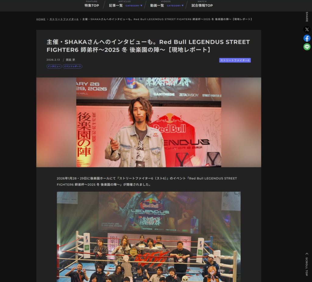 主催・SHAKAさんへのインタビューも。Red Bull LEGENDUS STREET FIGHTER6 師弟杯~2025 冬 後楽園の陣~【現地レポート】が、Progaming.jpに掲載されました。
