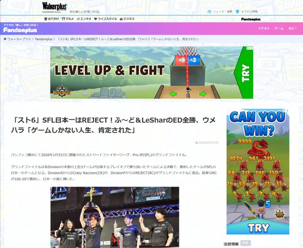 「スト6」SFL日本一はREJECT!ふ~ど&LeSharのED全勝、ウメハラ「ゲームしかない人生、肯定された」が、ウォーカープラスに掲載されました。