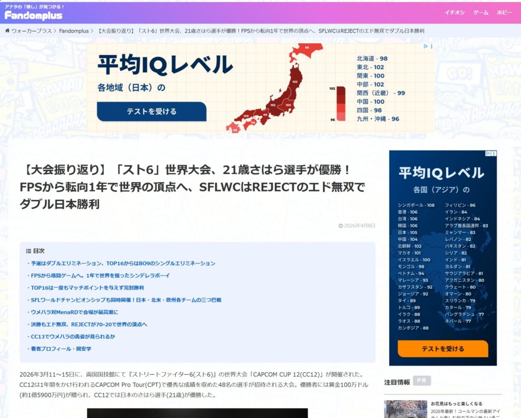 【大会振り返り】「スト6」世界大会、21歳さはら選手が優勝!FPSから転向1年で世界の頂点へ、SFLWCはREJECTのエド無双でダブル日本勝利が、ウォーカープラスに掲載されました。