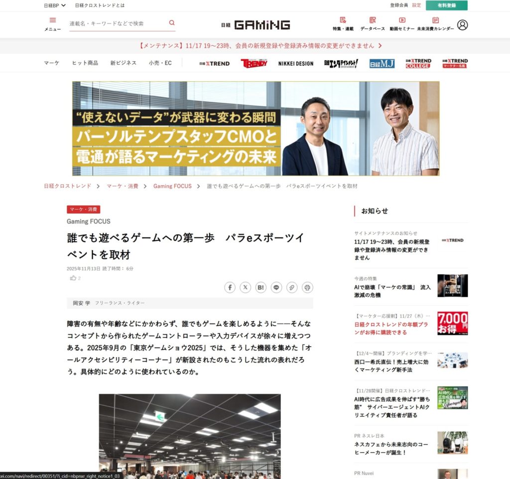 投稿日: 2025年11月14日2025年11月14日 投稿者: digiyas【掲載情報】誰でも遊べるゲームへの第一歩 パラeスポーツイベントを取材 誰でも遊べるゲームへの第一歩 パラeスポーツイベントを取材が、日経Gamingに掲載されました。 共有:FacebookXいいね:いいね 読み込み中…