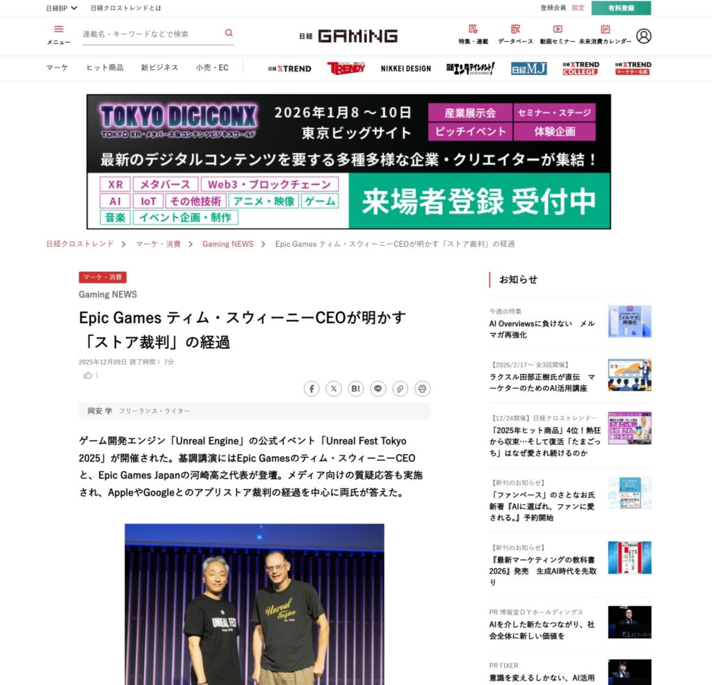 投稿日: 2025年12月10日2025年12月10日 投稿者: digiyas【掲載情報】Epic Games ティム・スウィーニーCEOが明かす「ストア裁判」の経過 Epic Games ティム・スウィーニーCEOが明かす「ストア裁判」の経過が、日経Gamingに掲載されました 共有:FacebookXいいね:いいね 読み込み中…