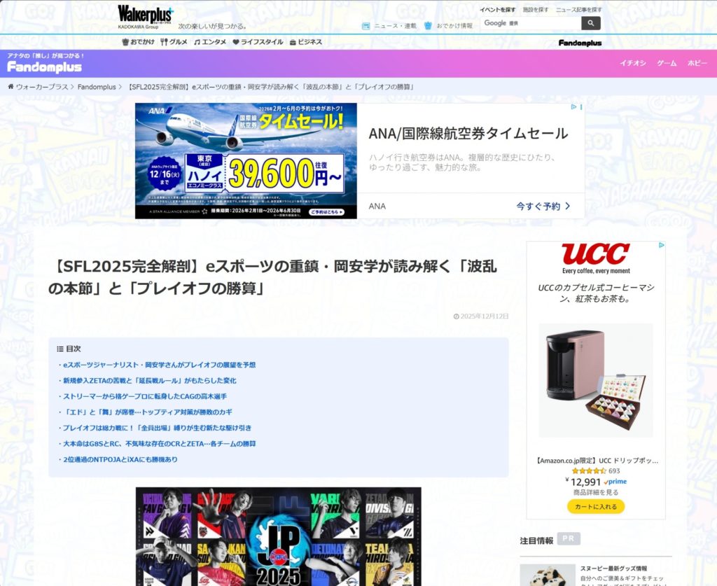 投稿日: 2025年12月13日2025年12月13日 投稿者: digiyas【掲載情報】【SFL2025完全解剖】eスポーツの重鎮・岡安学が読み解く「波乱の本節」と「プレイオフの勝算」 【SFL2025完全解剖】eスポーツの重鎮・岡安学が読み解く「波乱の本節」と「プレイオフの勝算」が、ウォーカープラスに掲載されました。 共有:FacebookXいいね:いいね 読み込み中…